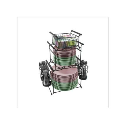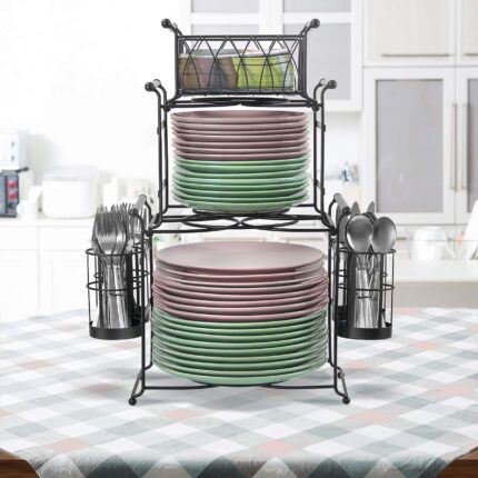 • 7-PIECE BUFFET CADDY (BLACK) — This all-in-one service station keeps dining essentials organized and accessible — Includes (2) center stands for dinner, appetizer, or dessert plates, (4) side flatware compartments, and (1) top napkin basket