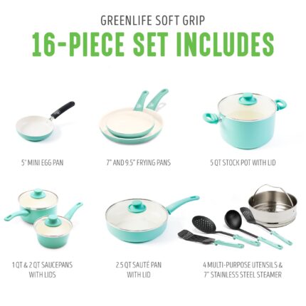 GreenLife Soft Grip Healthy Ceramic Nonstick 16 Piece Kitchen Cookware