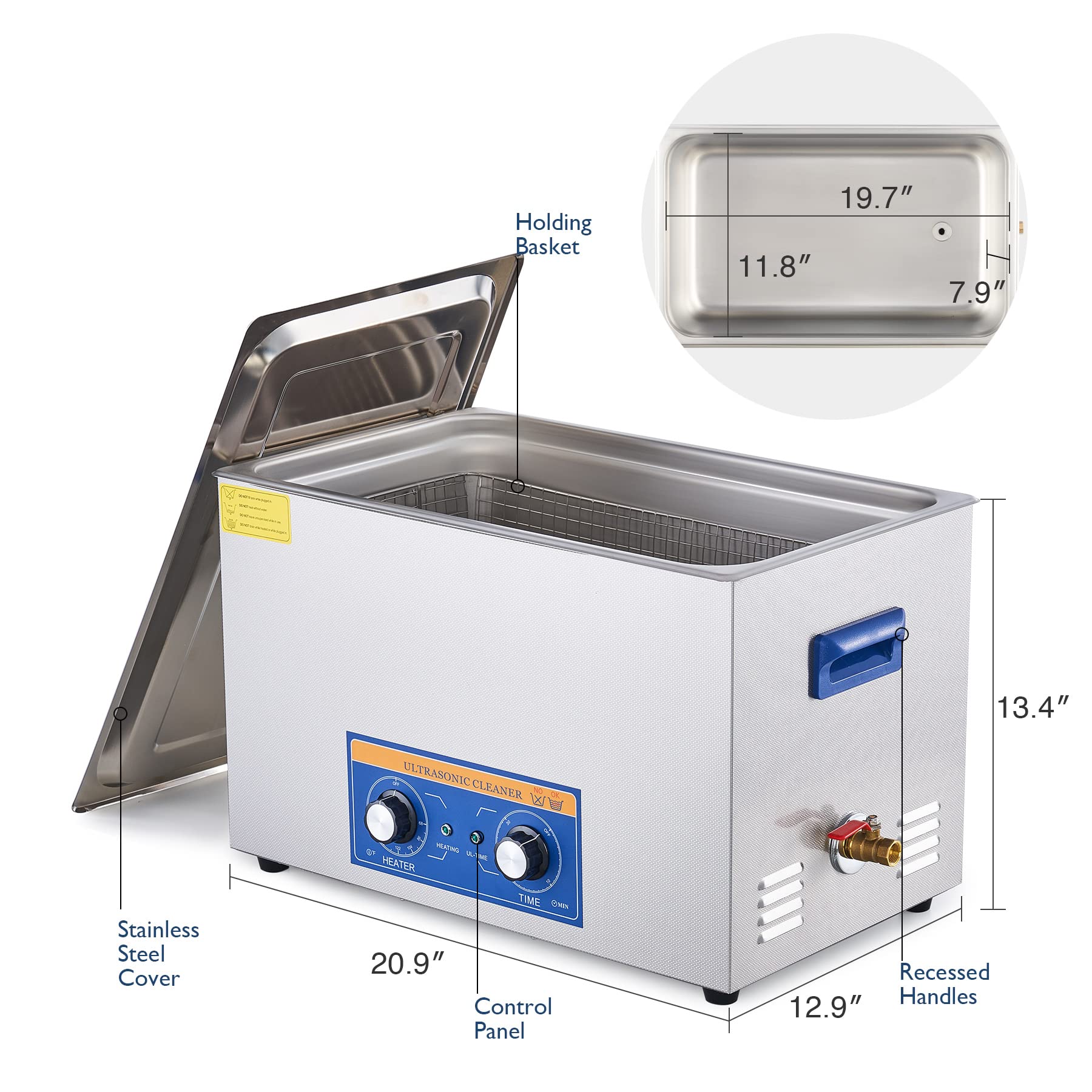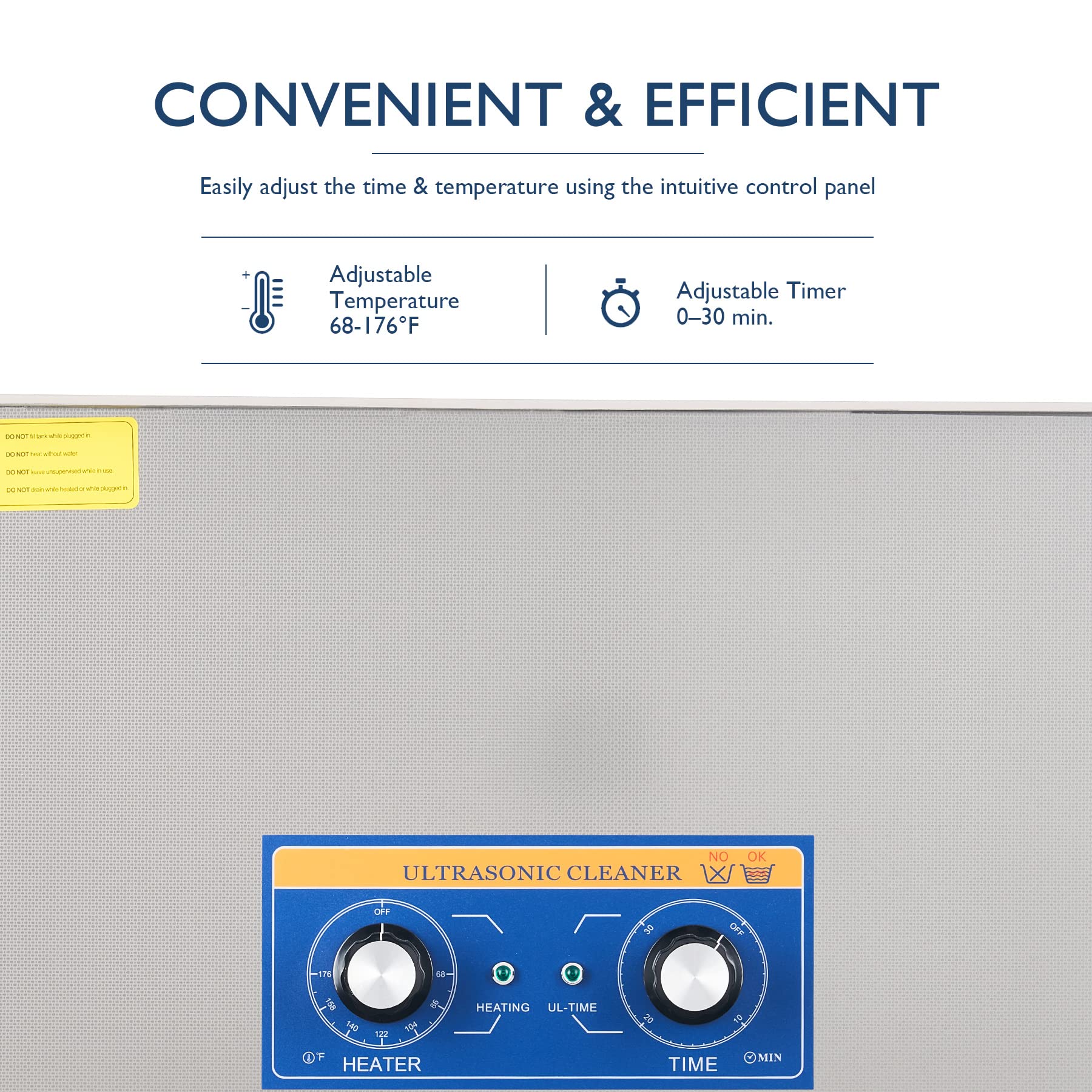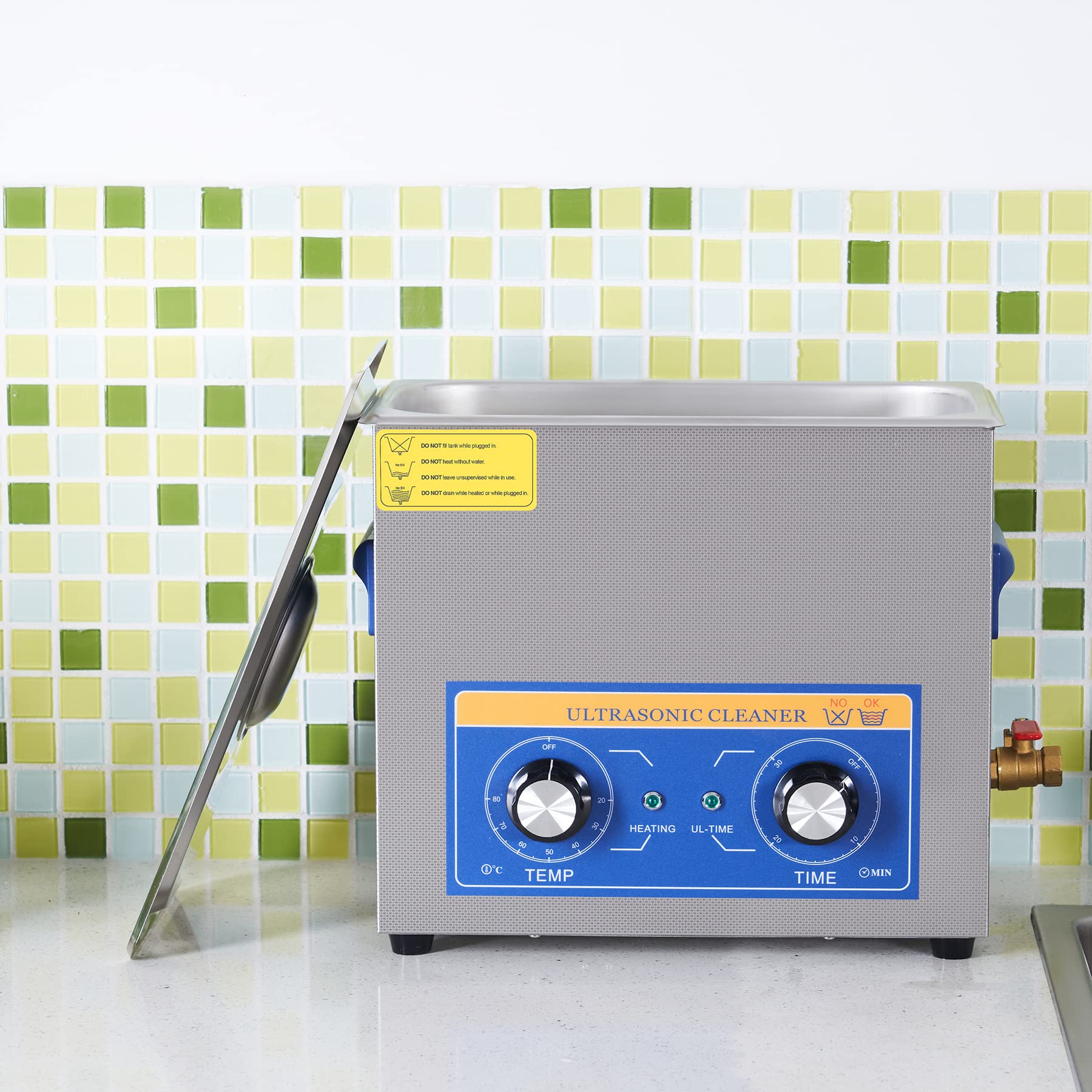 CREWORKS’ 600W ultrasonic cleaner is just the thing! Its 40kHz sound waves agitate the water in the half gallon basin to create cavitation: tons of tiny air bubbles whose miniscule implosions safely scour even delicate and intricate surfaces to clean them thoroughly and remove any contaminant, tarnish, or build-up. Combining this effect with gentle cleansers like soap or detergent and our ultrasonic washer’s own 500W of heating power provides even greater strength to get at the most caked-in grime. The control panel provides timed cleaning up to 30 minutes (not that you’ll need so long) and heated cleaning at temperatures between 68 and 176 F. Perfect for home, class, or laboratory use, this ultrasonic cleaning machine cleans tools, necklaces, earrings, piercings, glasses, watches, retainers, baby toys, and more in minutes at the push of a button. Enjoy years of helpful use thanks to stainless steel construction inside and out (including the inner basket), built-in protection against electrical surges, and 4 non-skid rubber feet to grip any countertop. Best of all, our cavitation cleaner remains compact and easily portable thanks to the inset handles on either side.
