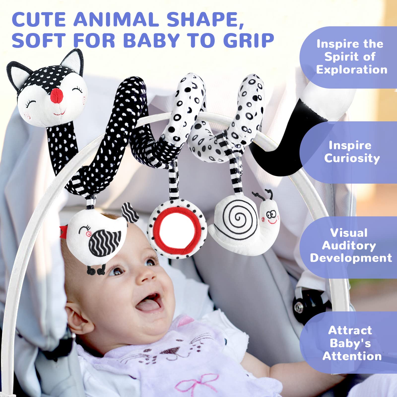 The 3 soft plush toys can be rearranged and detached individually. You can easily hang them on the car seat, baby carrier, stroller bar, crib, shopping carts, bassinet, or play gym so that the baby can play with them at all times and anywhere. The interesting toy will encourage babies to explore.