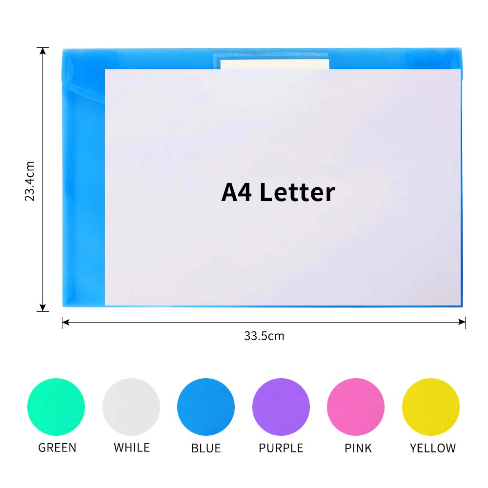 • Colorful Transparent Envelopes & Large Capacity: 6 assorted colors: transparent, blue, green, yellow, purple and pink . It’s easy to organize and distinguish your paper with different color. The envelope folder size is 13.25 x 9.25 inches, it will hold no less than 200 sheets A4 Papers.